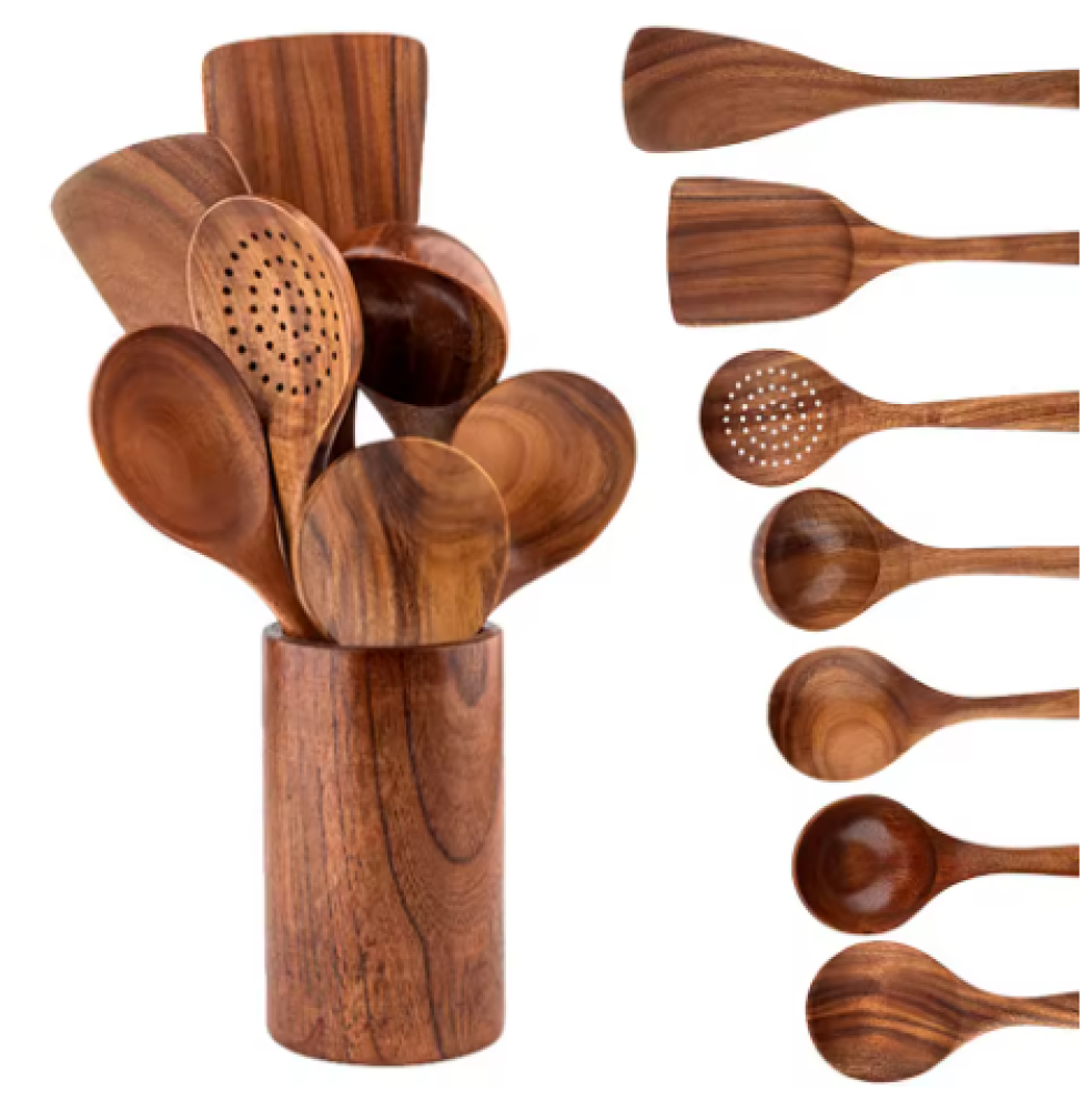 احصل على طقم الملاعق الخشبية مع الحامل الآن من متجر monavi وامنح مطبخك لمسة من الأناقة والطبيعة.