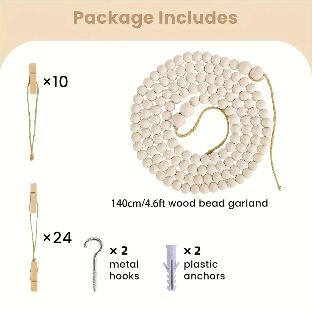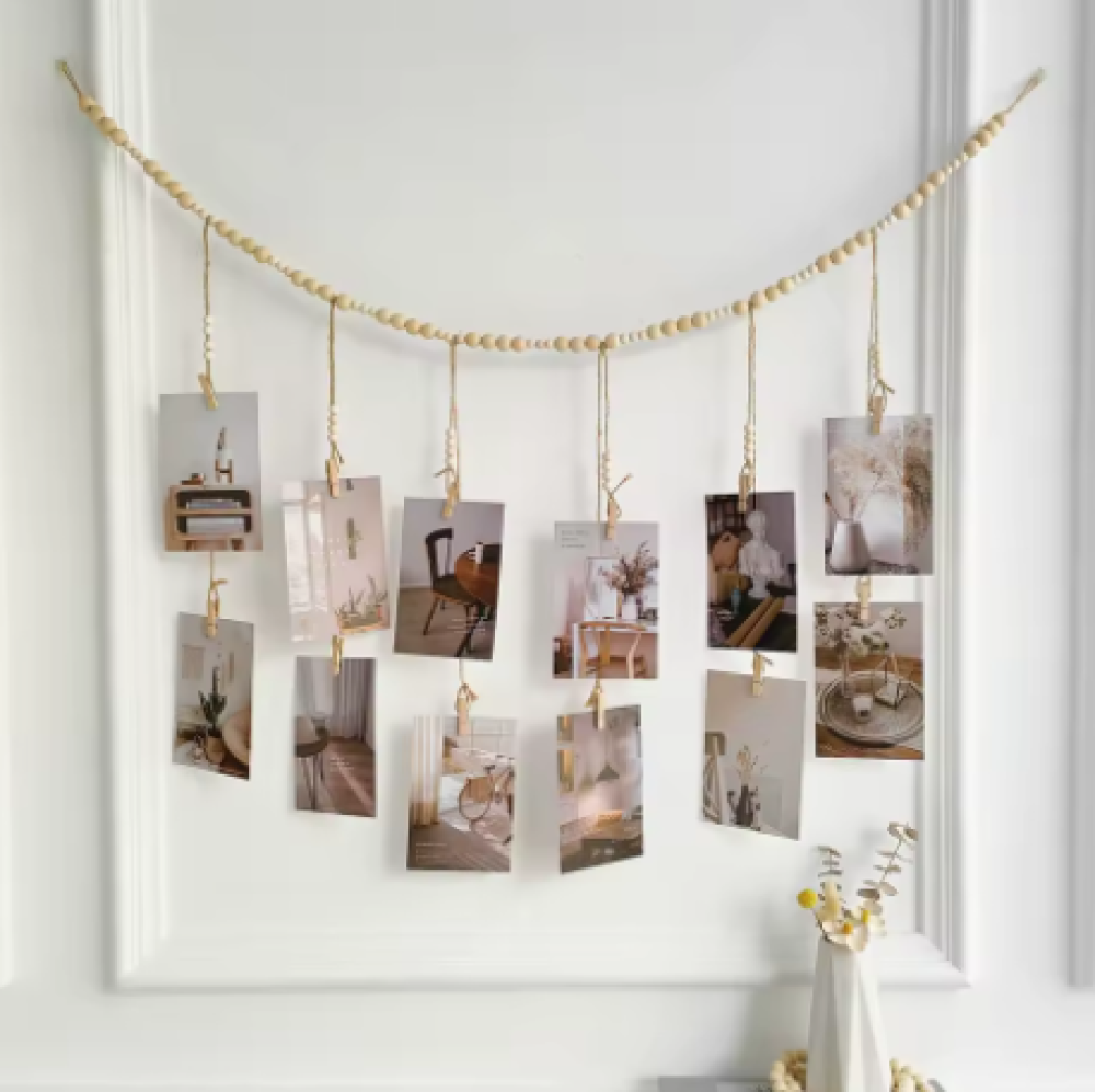 مكرامية أنيقة لتعليق الصور مزينة بكرات خشبية طبيعية، تضيف لمسة دافئة وعصرية إلى ديكور منزلك وتتيح لك عرض صورك وذكرياتك بشكل مبتكر ومميز.